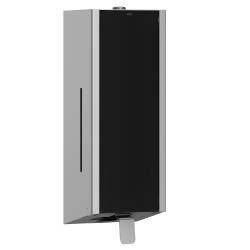 Seifenspender für Aufputzmontage, Chromnickelstahl, Oberfläche seidenmatt, Front schwarzes ESG-Glas, Gehäuse mit InoxPlus Oberfläche nveredelung zur Reduzierung von Fingerabdrücken und besseren Reinigungseigenschaft (easy to clean), Materialstärke 1,2 mm, seitliche Sichtfenster, geeignet für Flüssigseife oder Lotionen, 800 ml Nachfüllbehälter, mit Edelstahldruckhebel, Befestigung Spendermechani smus an der Front für eine einfache Befüllung, inklusive Befestigungsmaterial. Abmessungen 120 x 345 x 120 mm (B x H x T)