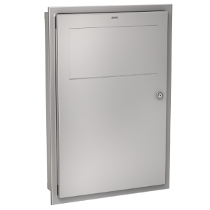 Abfallbehälter, für Unterputzmontage, Chromnickelstahl, Oberfläche seidenmatt, Materialstärke 0,8 mm, mit selbstschliessendem Klappdeckel, mit integrierter Sackhalterung, Zylinderschloss mit KWC Einheitsschlüssel, Fassungsvermögen zirka 13 Liter, inklusive Edelsta hlschrauben und Dübel. Abmessungen 395 x 580 x 110 mm (B x H x T)