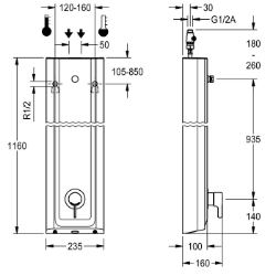 F5L-Therm Duschpaneel aus Mineralwerkstoff für Aufputzmontage mit Einhebel-Thermostat DN 15 und Anschlussstutzen für Duschkopf. Zum Anschluss an Warm- und Kaltwasser. Funktionsblock mit integrierter Mischkartusche und vormontierter Hygieneeinheit inklusive Sensor mit Steuerelektronik zur Durchführung einer automatischen Hygienespülung, programmgesteuerten thermischen Desinfektion (zusätzliche Bypass-Magnetventilkartusche notwendig) und Speicherung von Statistikdaten. Thermostatisch gesteuerte Mischkartusche mit Dehnstoffe lement und aktivem Verbrühungsschutz sowie einstellbarem, verdrehsicherem Temperaturanschlag und Keramikscheibentechnik. Ganzmetallausführung, sichtbare Teile poliert verchromt. Anschlussstutzen für separat notwendigen KWC-Duschkopf DN 15 mit vormontiertem Durchflussmengenregler 9,0 l/min. Gehäuse mit erhabener Funktionsfläche, aus kunstharzgebundenem Mineralwerkstoff MIRANIT, mit porenfreier, glatter Oberfläche (temperaturbeständig bis 80 °C), Farbton Alpinweiß. Anschlussschläuche mit absperrbaren Wassermengenregulierungen mit Rückflussverhinderer und Sieb. Aktivierte Hygienespülung, fixe Intervallzeit 24 Stunden. Mit Möglichkeit der Parametrierung und Kommunikation über optionale bidirektionale Fernbedienung. Hygieneeinheit wahlweise für Batteriebetrieb mit 6 V Lithium Batterie ( CR-P2) je Armatur oder separate Spannungsversorgung über Netzteil 6,75 V / 12 V DC. Gehäuseabmessung 235 x 1160 x 100 mm (B x H x T) Duschkopf sowie Batteriefach inklusive Batterie oder Netzteil zuzüglich Verlängerungskabel müssen separat bestellt werden.