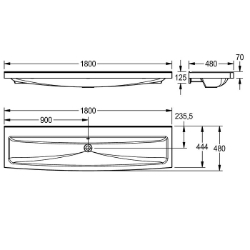 Reihenwaschplatz zur einreihigen Montage an der Wand, aus kunstharzgebundenem Mineralwerkstoff MIRANIT, porenfreie, glatte Oberfläche (temperaturbeständig bis 80 °C), Farbton Alpinweiß, Befestigung an Beckenrückwand, inklusive Armaturenbank, ohne Lochbohrung (Lochbohrung optional, Bohrpunkte markiert), mit Überlauf, inklusive Befestigungsmaterial, Ablaufset und Montageschablone. 3 Waschplätze Waschplatzbreite 600 mm Abmessungen 1800 x 170 x 480 mm (B x H x T)