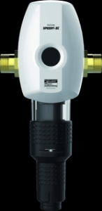 Filtergehäuse aus hochwertigem Kunststoff PN 16; Einbau-Drehflansch mit patentiertem Bajonettanschluss aus Messing mit Verschraubung (Gewindeanschluss nach DIN EN 10226-1); waagerechter oder senkrechter Einbau möglich; Filtergewebe aus Edelstahl; Rückspüleinheit; Handrad zur Rückspülung bei gleichzeitiger Reinigung des Schauglases; mit integriertem freien Auslauf und patentiertem Keramik-Spülventil; Schlauchanschluss; integrierte Rückspülmonatsanzeige.